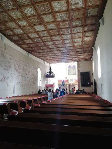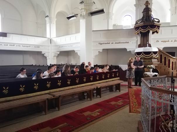 ekkor tudtunk bemenni a kazettás mennyezetű református templomba. Ennek