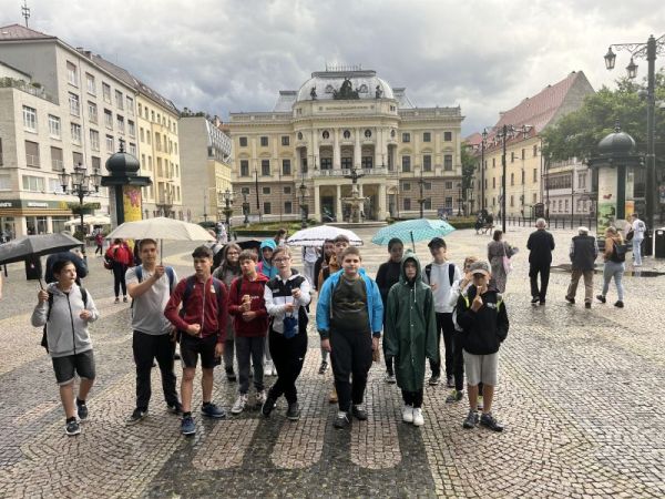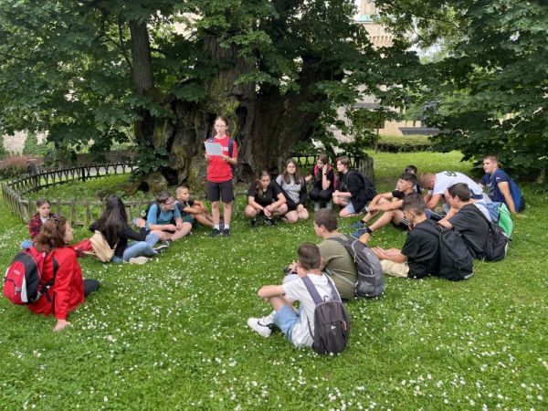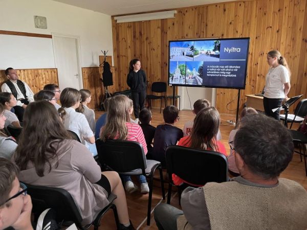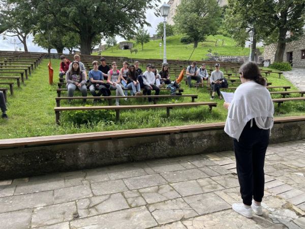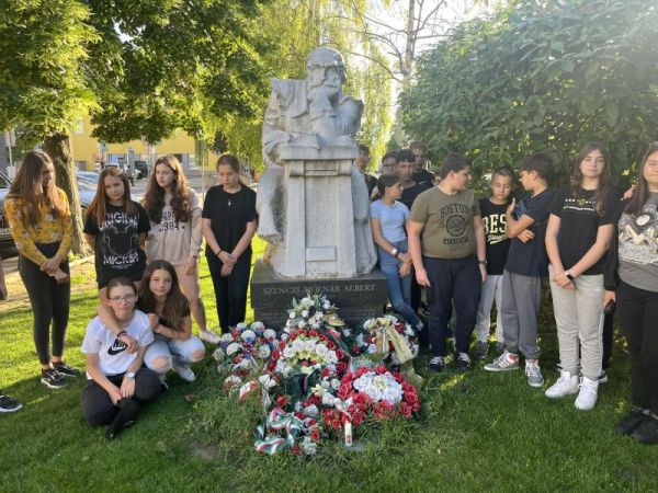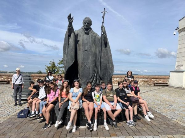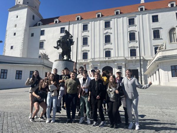 | Pozsonyban, a várudvarban a fiúk jó hangulatot teremtettek, ugyanis barátkozó kedvüknek köszönhetően egy csapat turista szeretett volna fotót készíteni velünk. Szencen egy szép címeres gyertyát gyújtottunk a magyar nyelvű protestáns költészet géniuszának emlékművénél. Itt kicsit kipihentük a pozsonyi vártúra fáradalmait, majd utaztunk tovább Nyitra felé. | |